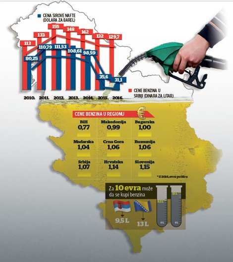 Gotovo u svim zemljama u okruženju cene goriva padaju. Slovenci su juče korigovali cene, a apsolutni rekorder je BiH, gde se litar benzina odnedavno prodaje za 0,77 evrocenti.