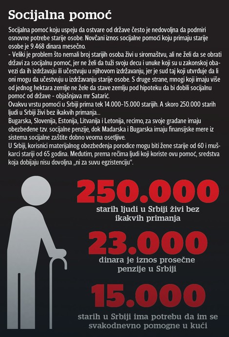 Kvalitet života starih ljudi u Srbiji uglavnom je veoma nizak. Malo je starijih ljudi koji su dobrog zdravlja, dobrog materijalnog statusa i žive u skladnim porodičnim odnosima. Većina starih ljudi u Srbiji živi sa skromnim penzijama, njen prosečan iznos je nešto preko 23.000 dinara. Još ako penzioner ima zdravstvenih problema i ako izostaje podrška i pomoć porodice – što i nije redak slučaj – starost i Srbiji zaista se pretvara u pakao.