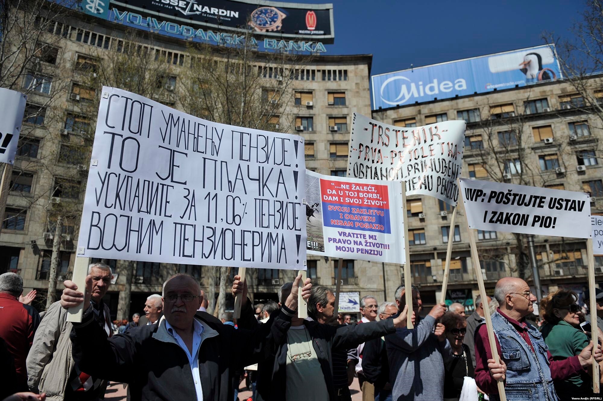 Protestu u centru Beograda pridružili su se i vojni penzioneri. Miloje Đukanović, jedan od njih, kaže da ga je država čak dva puta zakinula. 2008. zaobišlo ga je povećanje od 11,6 odsto, dok je poslednjim umanjenjem obuhvaćen kao i civilni penzioneri, jada se Miloje.